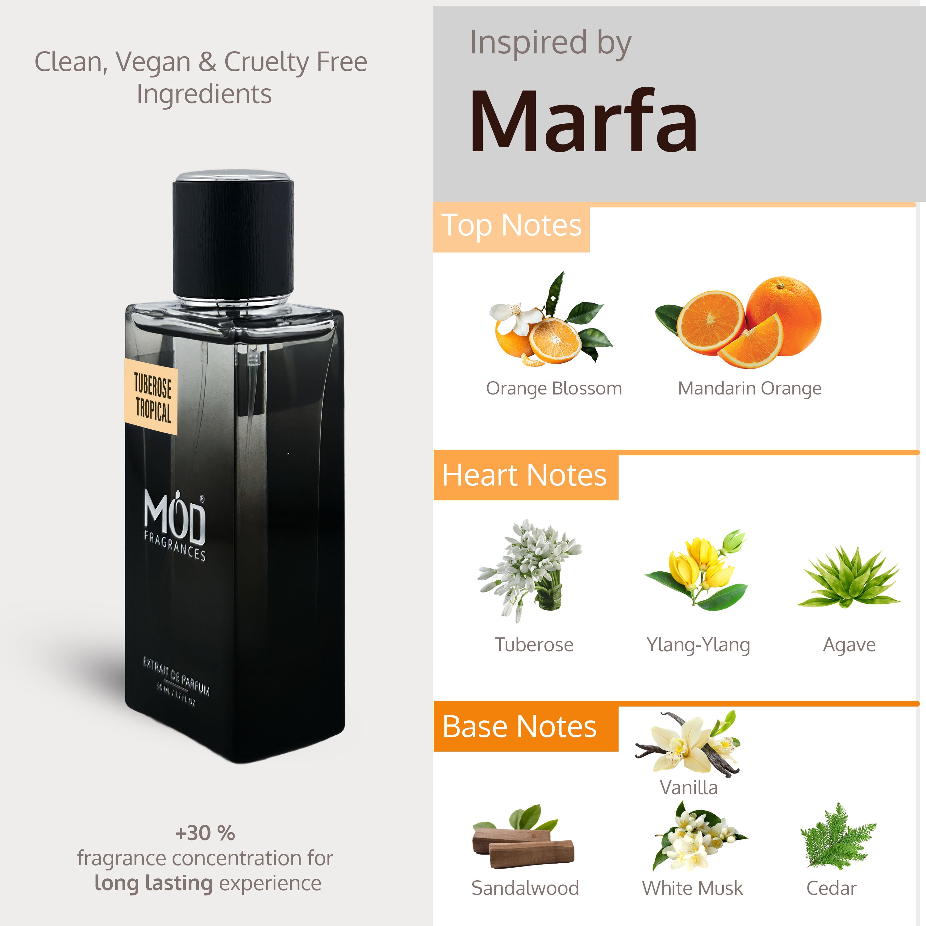 The Orange blossom Mandarin really shine as the top notes then it transitions into a nice creamy green tuberose ylang ylang gives a tropical vibe almost creamy banana nuance green watery nuance from the agave vanilla sandalwood is creamy white musk to help give it a nice clean boost to push the fragrance out with a nice scent trail and cedar to add some depth to the fragrance 10/10 great fragrance quality is amazing and very affordable! MOD knocked this one out of the park home run unisex and exotic