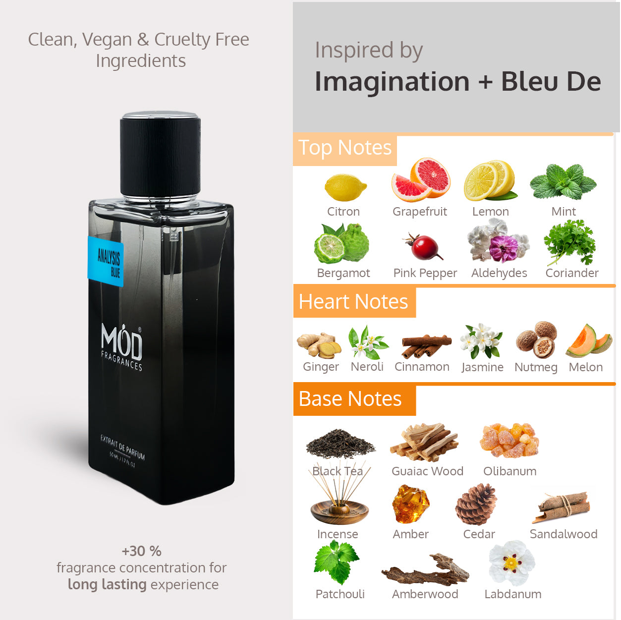 Mod Fragrances is defined by its commitment to crafting high-quality, designer-inspired scents with a refined touch. Each fragrance features an Extrait de Parfum concentration of 30–35%, ensuring richness and depth without being overpowering. We avoid heady, overly intense profiles in favor of smooth, balanced compositions that wear comfortably throughout the day. With a lasting power of 6 to 8+ hours—depending on skin chemistry—Mod fragrances offer enduring elegance. While we strive to stay as close as possible to the originals, slight differences in formulation and concentration create a unique interpretation of each scent.
