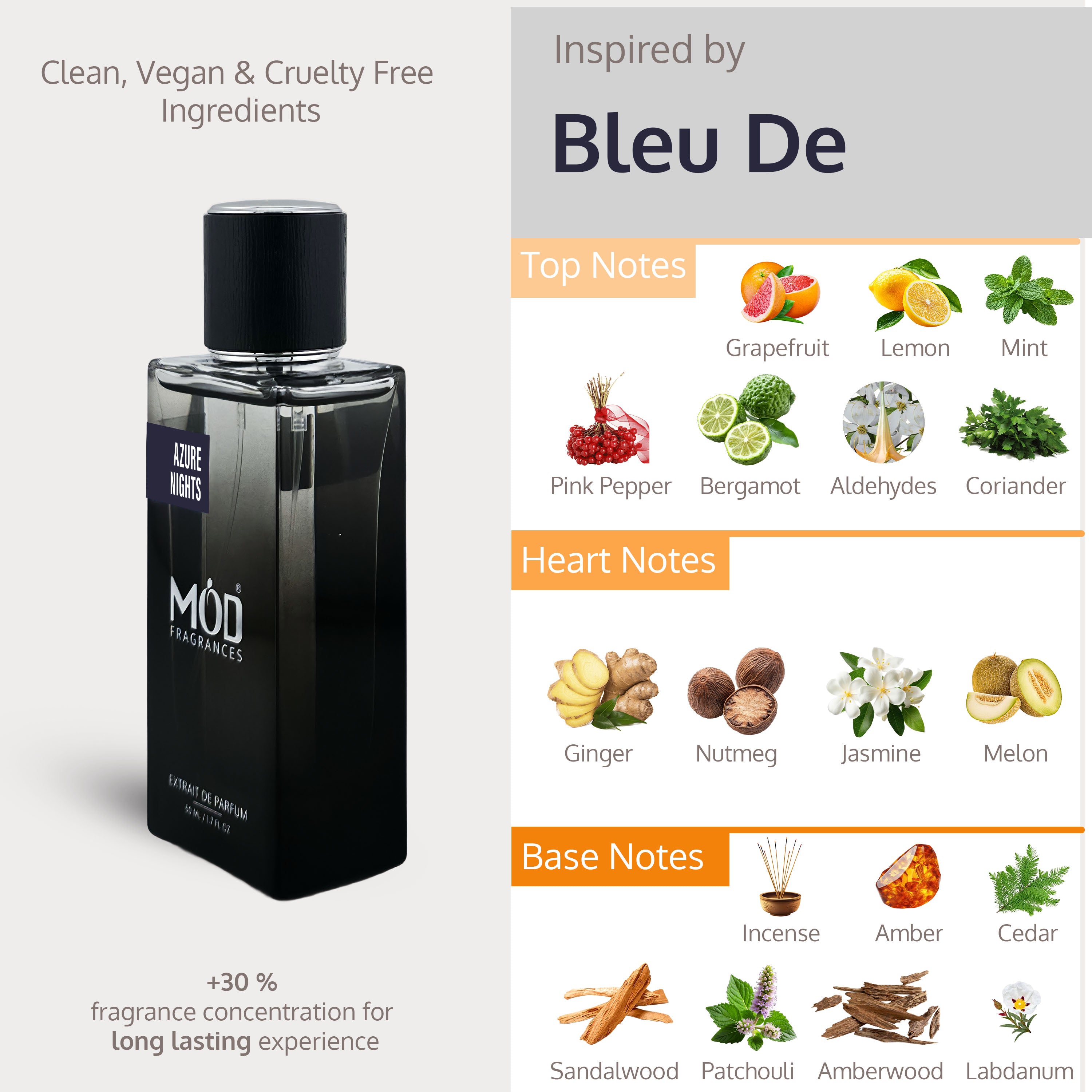 Azure Nights Extrait de Parfum – Inspired by the timeless fragrance Bleu, this scent captures the magnetic charm of starlit evenings and shimmering city lights. Fresh, bold, and sophisticated, it’s designed for the man who wants to leave an unforgettable impression.