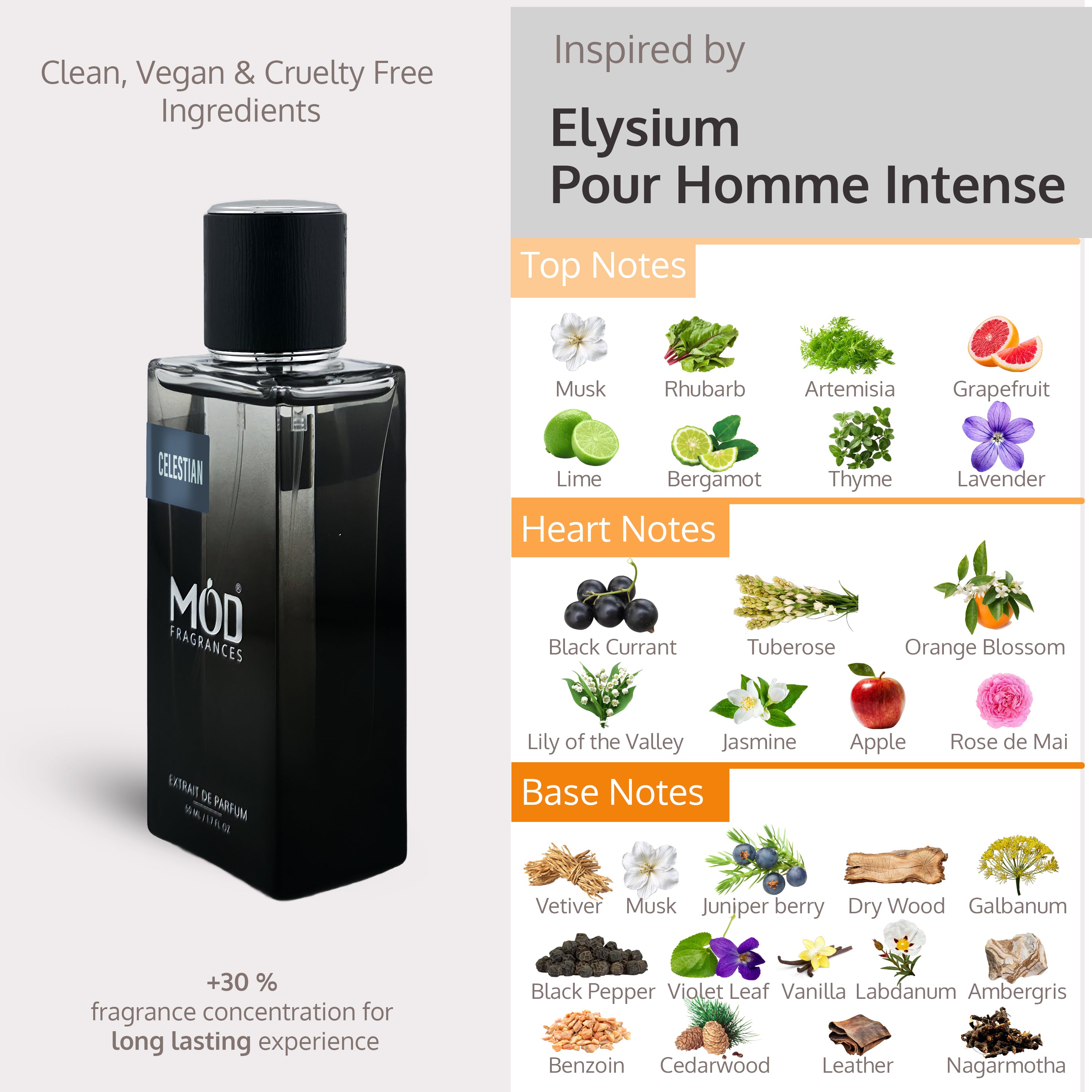 Inspired by Elysium Pour Homme Intense, Celestian is a fresh and powerful extrait de parfum for men, crafted for those who command attention with effortless sophistication. This long-lasting fragrance reimagines timeless elegance with a bold, modern twist, making it the perfect choice for any occasion.