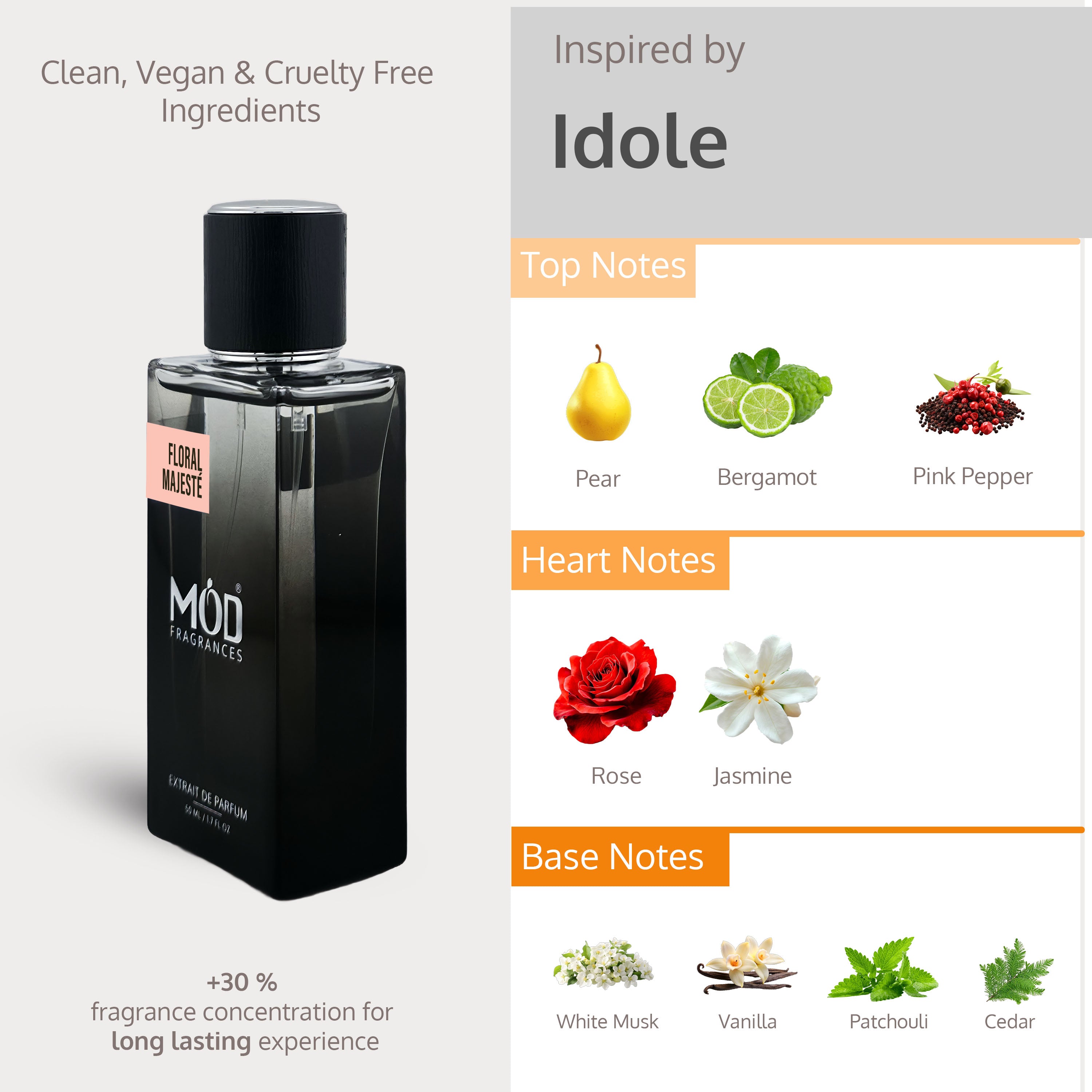 Inspired by Idole, Floral Majesté is a radiant extrait de parfum that celebrates modern femininity with elegance and charm. Designed for women who love to feel confident and captivating, this fragrance is fresh, floral, and effortlessly sophisticated.