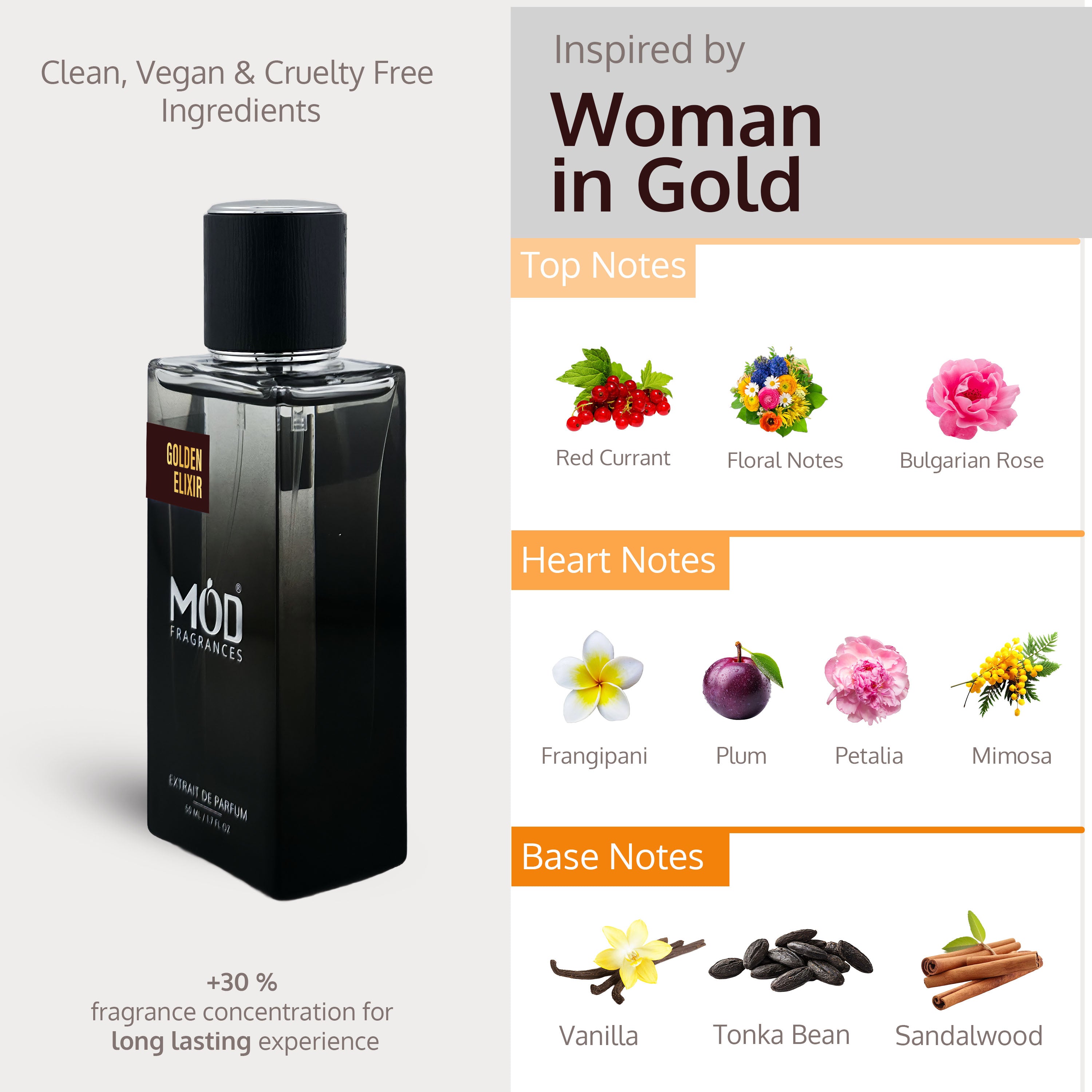 Golden Elixir Extrait de Parfum by Mod Fragrances is a luxurious fragrance inspired by the timeless elegance of Woman in Gold. Designed to envelop you in a radiant, golden aura, this exquisite scent combines citrus, floral, and warm gourmand notes for a captivating olfactory experience.