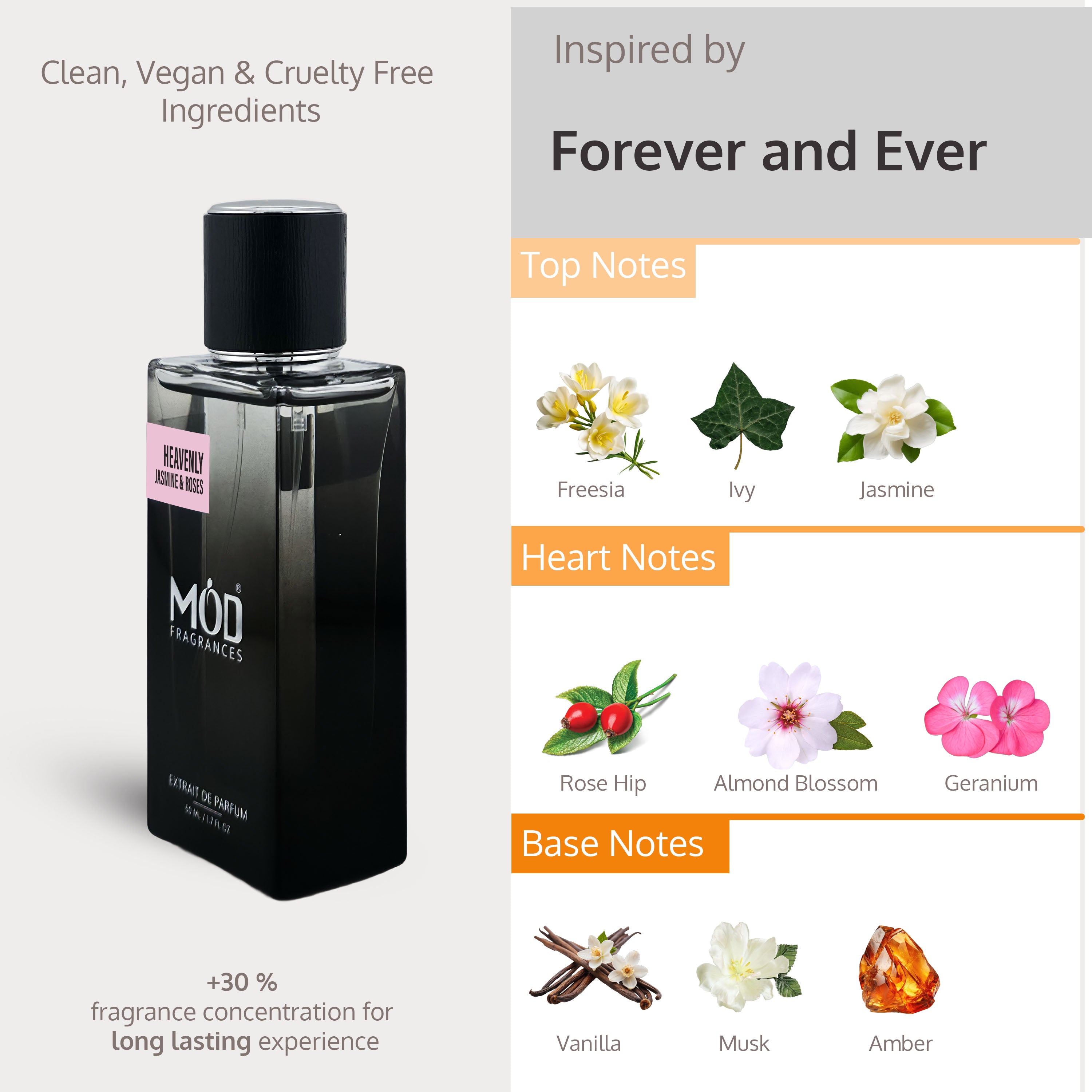 Introducing Heavenly Jasmine & Roses Extrait de Parfum by Mod Fragrances, a captivating scent inspired by the timeless elegance of Forever and Ever. This exquisite fragrance is a harmonious blend of top-quality ingredients that will transport you to a world of pure bliss.