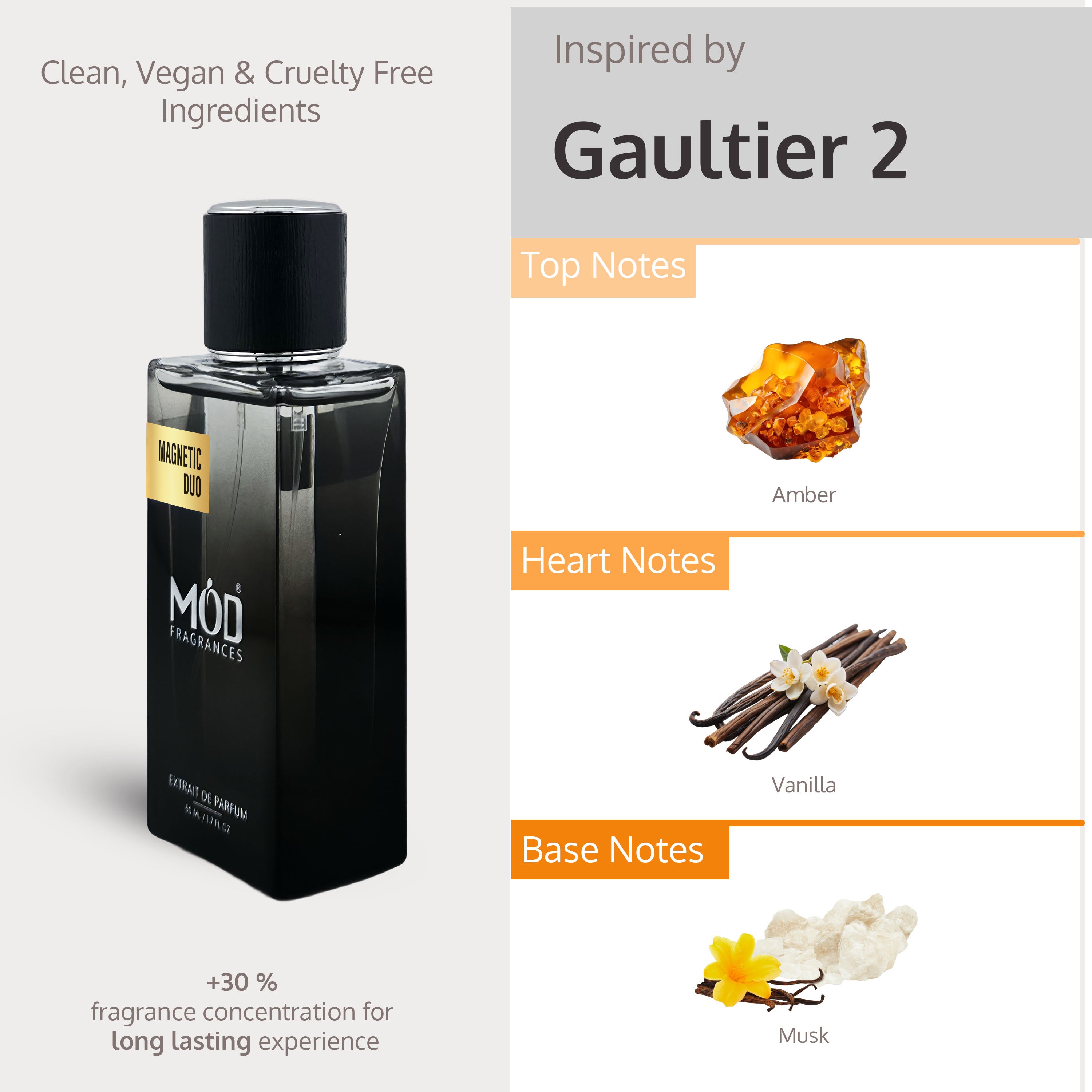 Crafted with meticulous attention to detail, Magnetic Duo by Mod Fragrances is a true masterpiece. The high concentration of essential oils in the extrait de parfum ensures exceptional longevity, allowing you to revel in its magnetic aura all day and night.