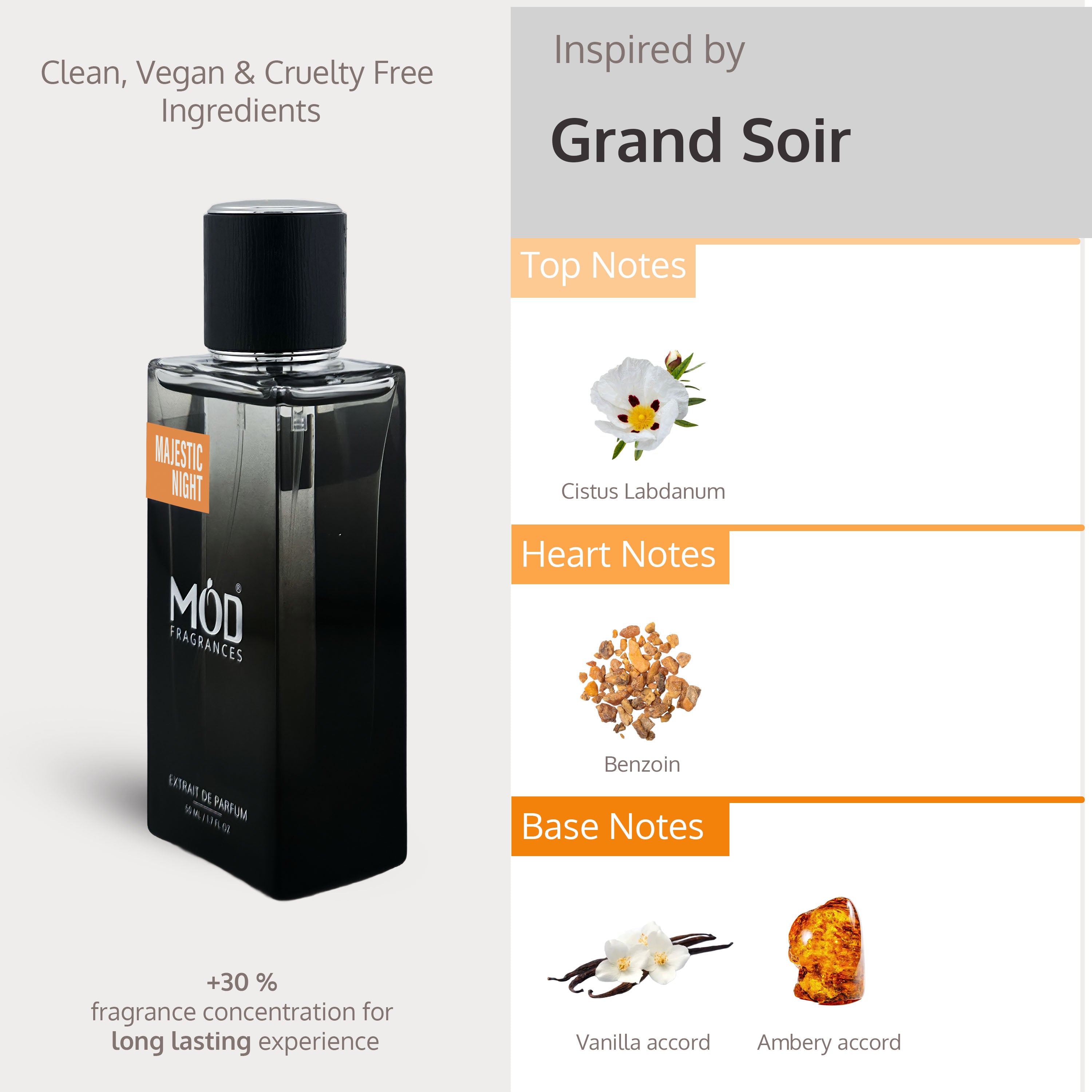 Introducing Majestic Night Extrait de Parfum, a luxurious fragrance inspired by the timeless elegance of Grand Soir. This enchanting scent captures the essence of refined evenings, blending warmth, sensuality, and sophistication into an unforgettable olfactory experience.